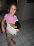 Sweet little "Mimi H" slinging her bunny, "Caesar" and her little chicken, "Bunny". She loves "wearing" her dollies too!!